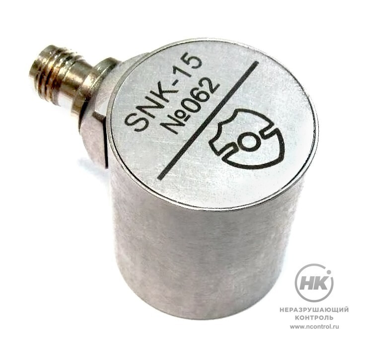 Преобразователь SNK-15 используется для измерений амплитуды ультразвукового смещения поверхности твёрдых тел в диапазоне частот от 30 до 150 кГц. Выполнен в цилиндрическом пылевлагонепроницаемом корпусе из нержавеющей стали, внутри которого имеется пьезокерамический элемент. Преобразователь имеет разъём SMA для соединительного кабеля. По заказу кабель оснащается разъёмами FME, Lemo, MCX, MMCX, SMA, UHF, иможет иметь длину от 100 до 1000 мм.