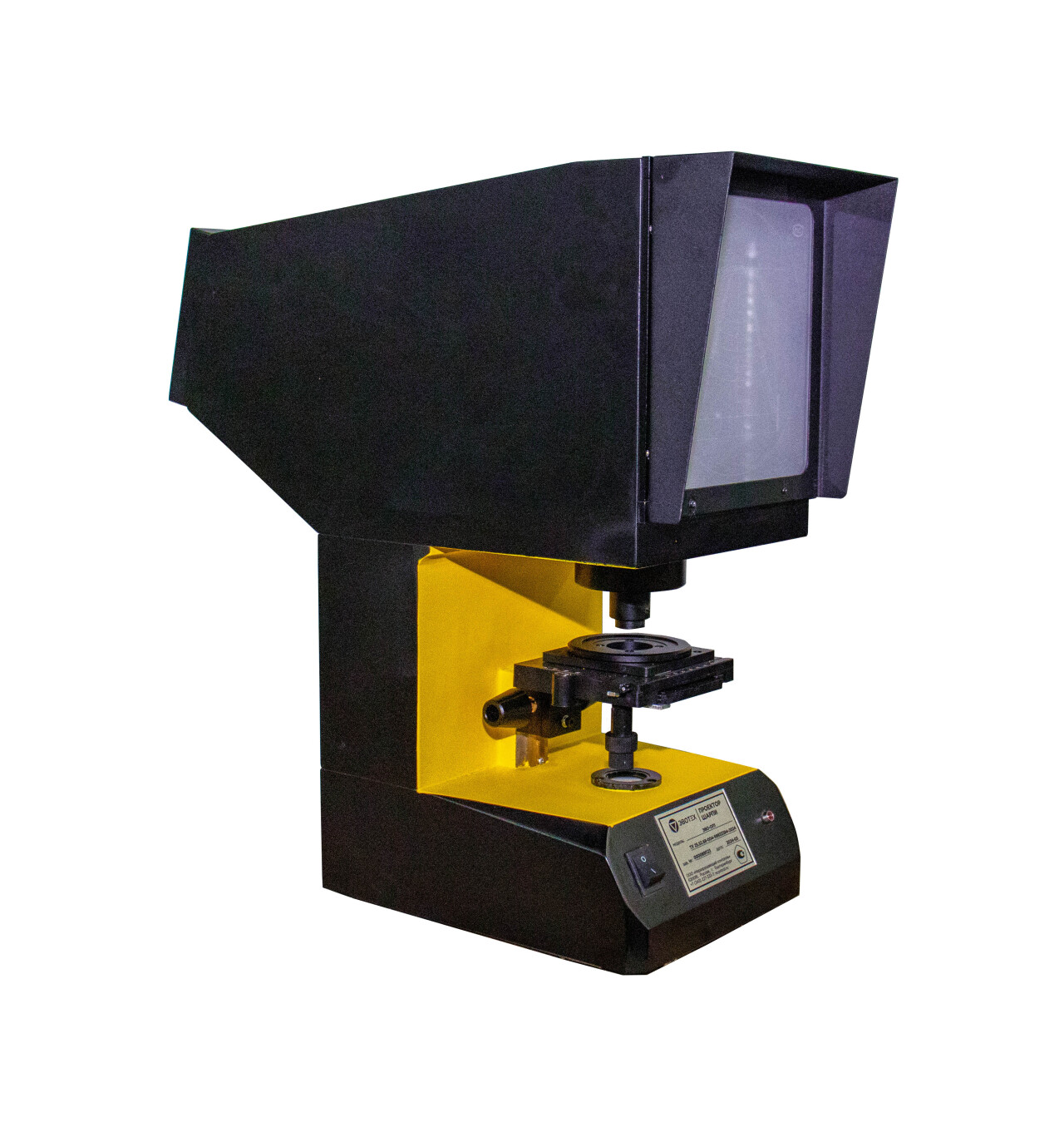Проектор оснащен проекционным экраном с нанесенными методом фотолитографии точными шаблонами стандартных надрезов. На экране отображается увеличенное изображение детали или объекта.
