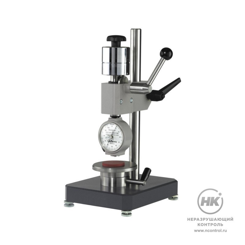 На механическом штативе BS 61 II установлен твердомер (дюрометр) модели HP. Результаты измерений зависят от точности проведения испытания и от формы образца. Если толщина материала образца меньше 6 мм, то для получения точных результатов испытания, согласно DIN ISO 48, следует проводить по методу IRHD micro.
