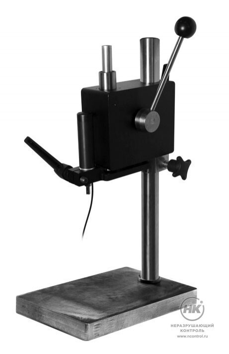 Штатив обеспечивает плавное механические нагружение, а также перпендикулярное положение преобразователя в процессе измерения твердости, что позволяет устранить ошибки оператора в процессе контроля твердости, уменьшить разброс показаний единичных измерений твердомера.