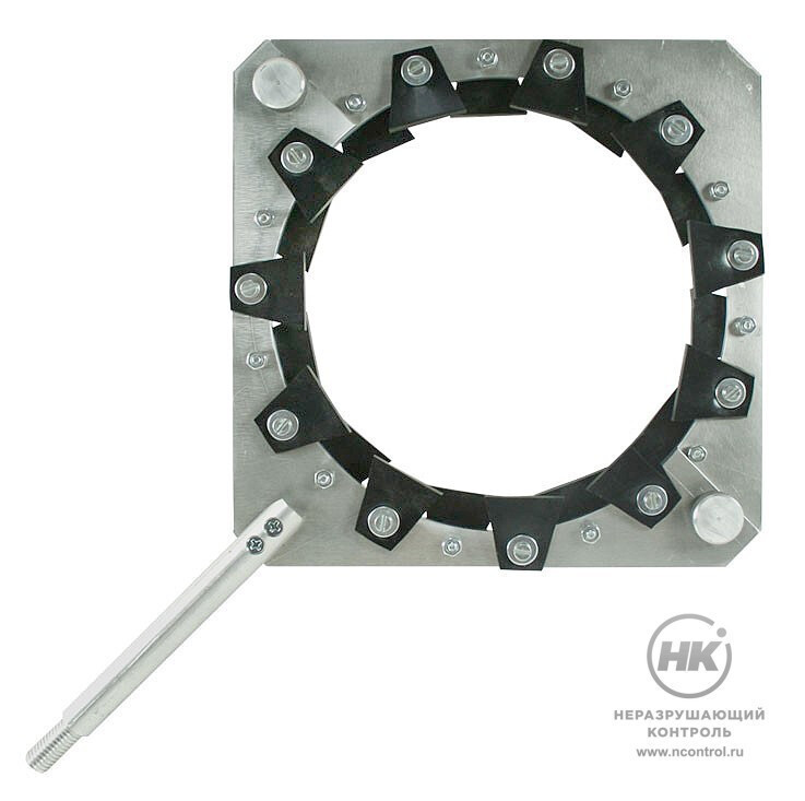Кольцевой резиновый электрод стыкуется с высоковольтным трансформатором-держателем через удлинитель, и оператор вручную контролирует поверхность покрытия. Несколько типоразмеров и форм обеспечивают лёгкость перемещения электрода и высокую производительность контроля.