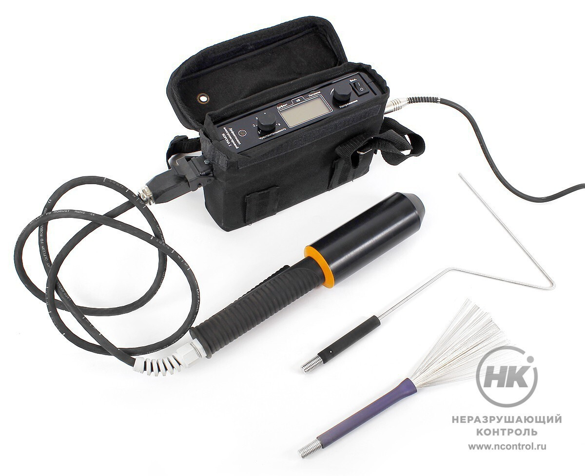 Конструктивно дефектоскоп состоит из электронного блока саккумулятором, высоковольтного трансформатора-держателя совстроенным кабелем, провода заземления с магнитом изажимом. В комплекте поставки есть штырь-заземлитель, удлинитель и сменные электроды. Оболочки прибора надёжно изолированы изащищены от электрического пробоя в нормальных рабочих условиях и при рекомендуемых значениях влажности.