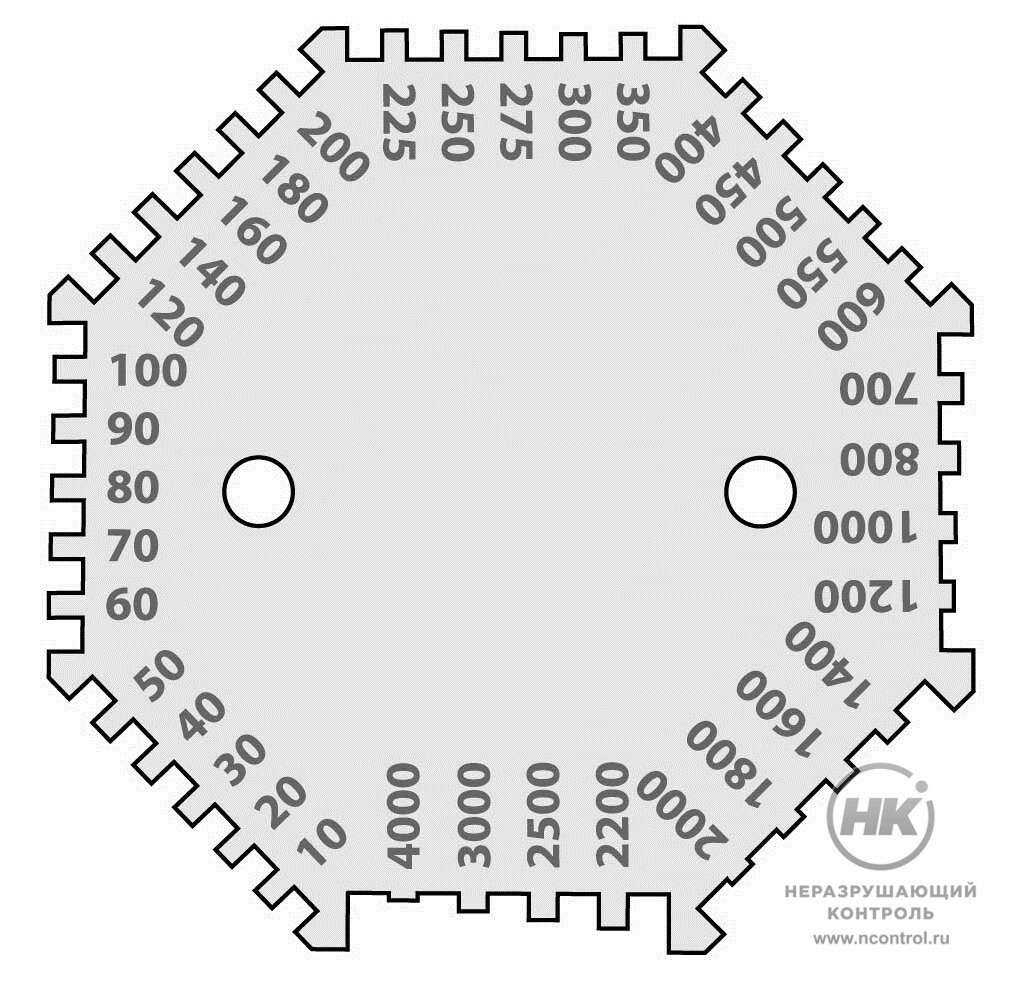 Толщиномер-гребенка представляет из себя шаблон, изготовленный из пластины нержавеющей стали. Гребенка имеет две опорные базы на каждой из граней и набор выступов с фиксированным зазором относительно баз. Величина зазора отмечена на выступе. За толщину принимается наибольший зазора зуба, смоченного покровным материалом.