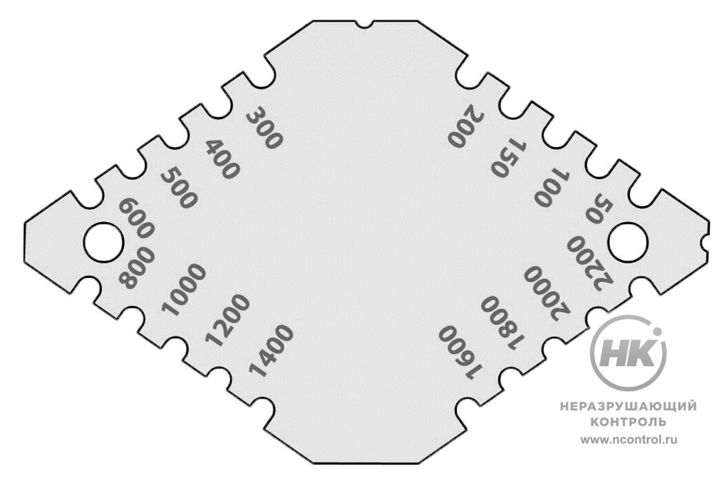 Толщиномер-гребенка представляет из себя шаблон, изготовленный из пластины нержавеющей стали. Выступы и опорные базы имеют клиновидную форму, обеспечивающую их легкий вход в порошок. Гребенка имеет две опорные базы на каждой из граней и набор выступов с фиксированным зазором относительно баз. Величина зазора отмечена на выступе. За толщину принимается наибольший зазора зуба, смоченного покровным материалом.
