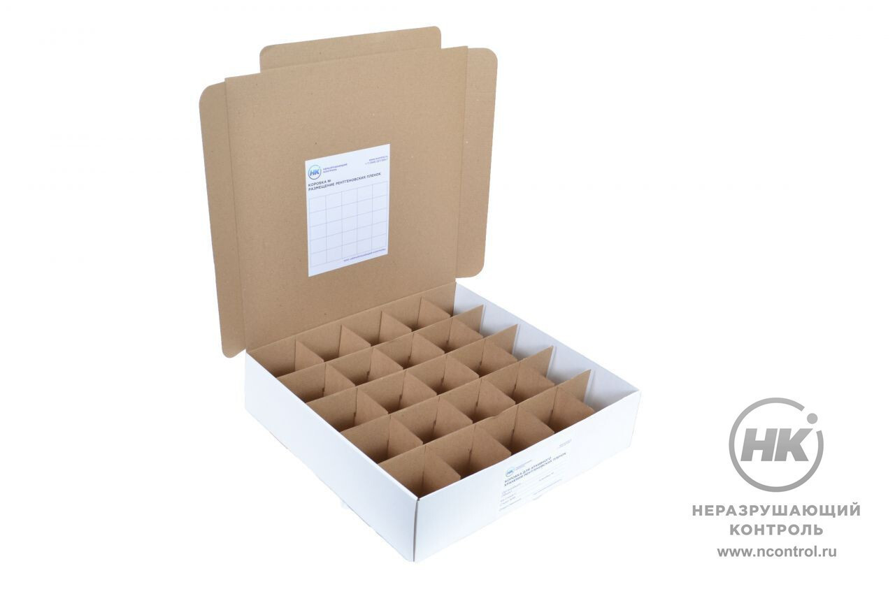 Коробка предназначена для архивного хранения экспонированных и обработанных рентгеновских плёнок. Вмещает 25 плёнок шириной до 100 мм. Изготовлена из гофрокартона.