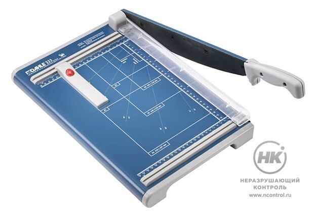 Резак Dahle 533 имеет металлический стол, на рабочую поверхность нанесена разметка. Верхний нож резака с плоской шлифовкой вместе с нижним ножом обеспечивают точную линию реза. Корпус снабжён пластиковыми накладками, которые служат ручками для переноски резака.