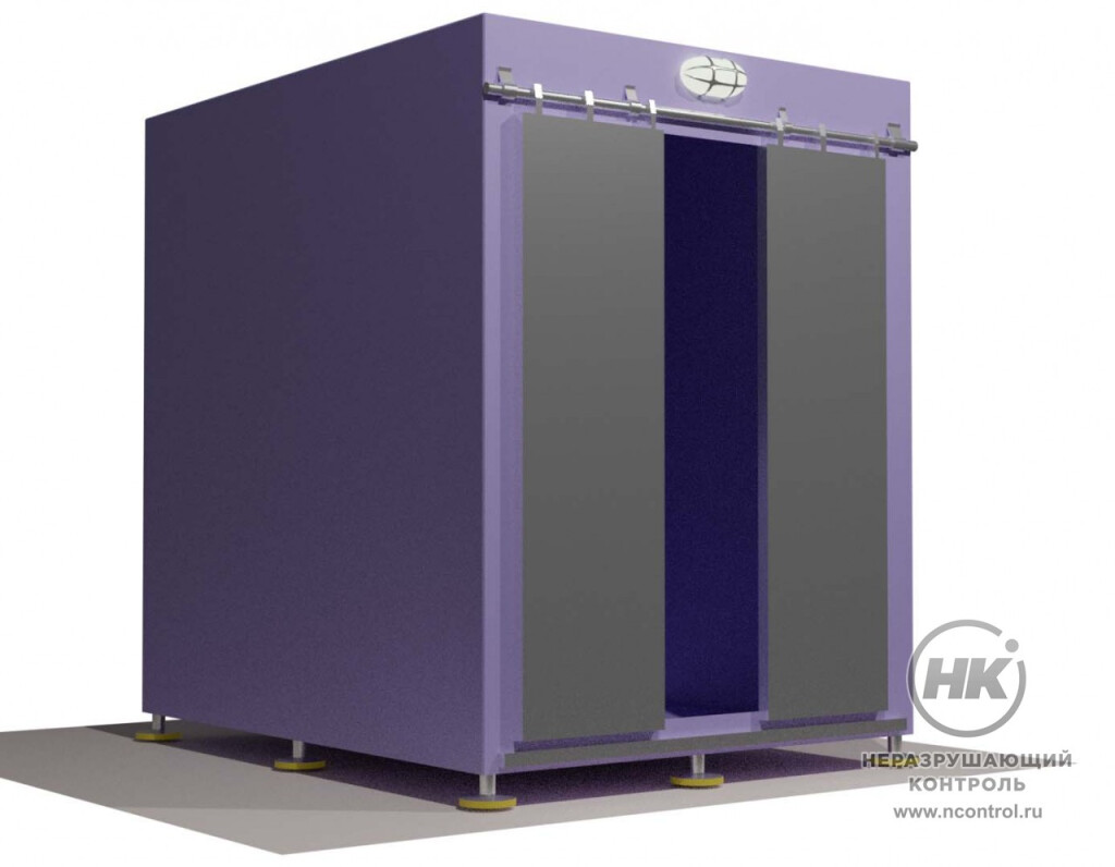Кабина радиационной защиты с раздвижными двустворчатыми воротами откатного типа с электрическим приводом, со световой, звуковой сигнализацией и системой оптического барьера безопасности при открывании и закрывании двери и электрическим щитом управления.