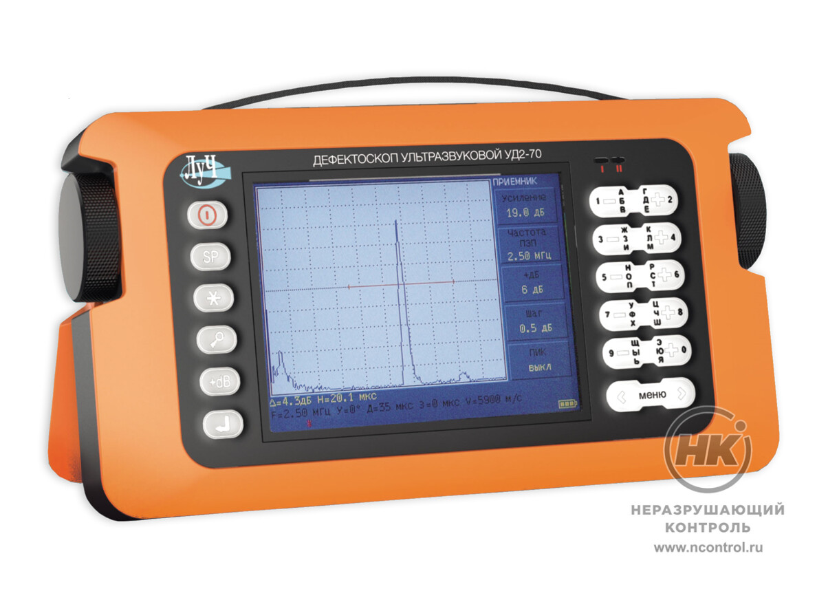 УД2-70 — ультразвуковой дефектоскоп, предназначенный для выявления мест нарушений сплошности и однородности различных материалов, сварных соединений, изделий из металлов. Измеряет глубину и координаты залегания дефектов и отношения амплитуд сигналов от дефектов. Диапазон измерения по стали 1 – 7 500 мм. Выпускается в нескольких специализированных комплектациях для контроля железнодорожных составов.