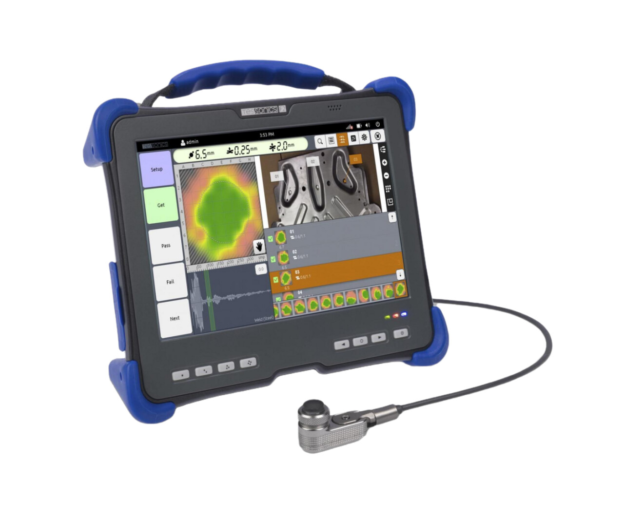 RSWA F-2– единственный в мире прибор, использующий уникальный 52-элементный или 120 элементный ультразвуковой матричный преобразователь, позволяющий получать информацию о размере, внутренней структуре и о поверхности исследуемого литого ядра точечной сварки.