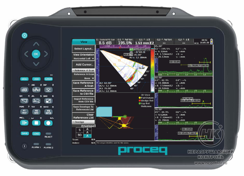 В зависимости от модели дефектоскоп совместим с ФР преобразователями до 64 элементов. S-скан, L-скан, виды сверху и сбоку отображаются в реальном времени. Время работы без подзарядки до 7 часов.