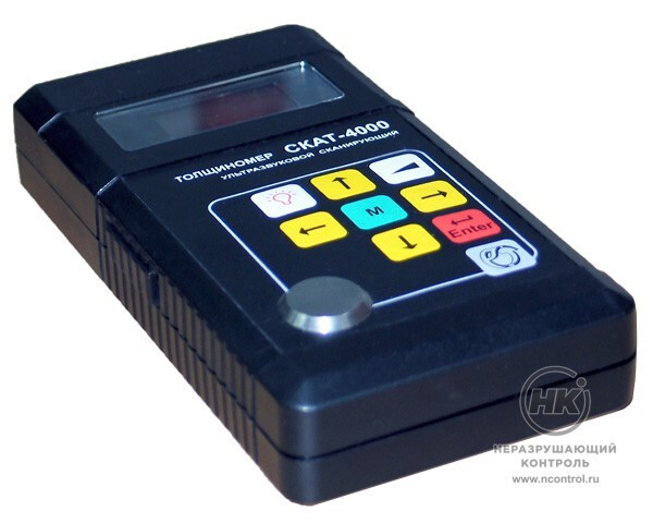 Ультразвуковой толщиномер «СКАТ-4000» со встроенным микропроцессором применяется для измерения толщины изделий из различных металлов, сплавов и пластмасс. Диапазон измерений 0,6 – 200 мм. Снят с производства. Замена — толщиномер А1209.